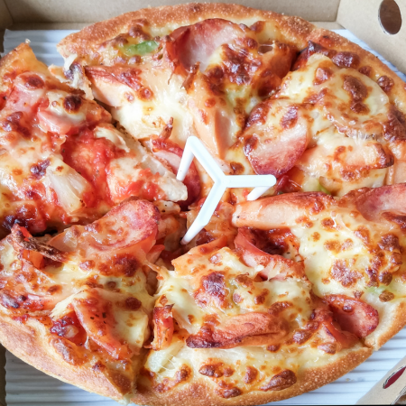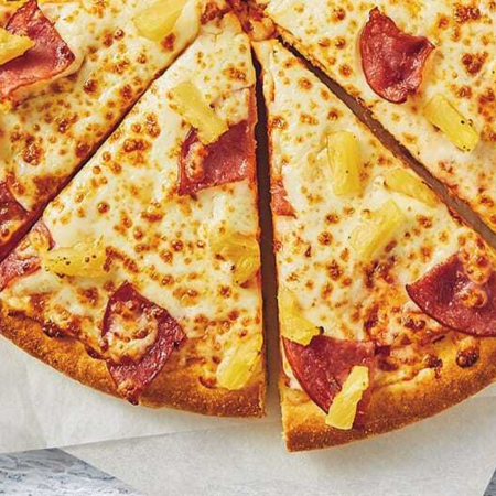 Give your taste buds a tropical vacation with this amped up Hawaiian pizza. It's got tasty chicken, ham, pineapple AND green peppers.
