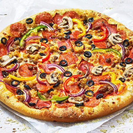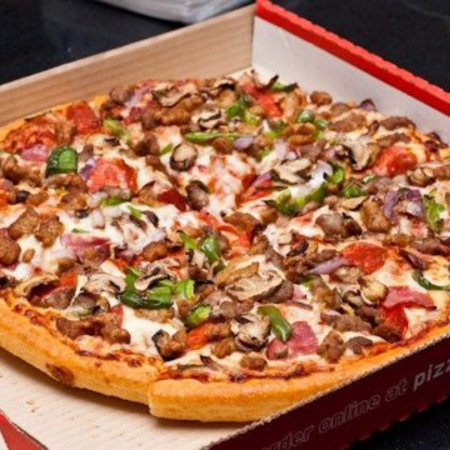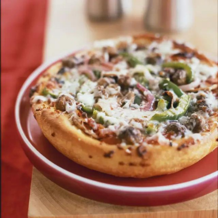This loaded pizza is the perfect choice for family dinner or a lunch with your crew. Includes pepperoni, seasoned pork, beef, mushrooms, green bell peppers and red onions.