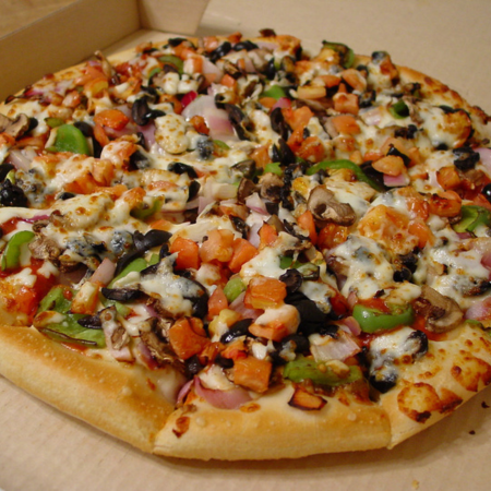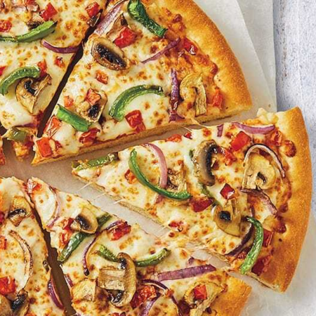 Pizza is officially a vegetable. This garden delight has all the fresh veggie toppings you love: mushrooms, red onions, green bell peppers, Roma tomatoes and black olives.