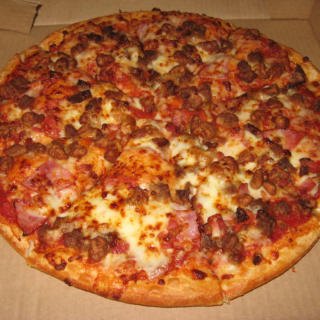 Packed with pepperoni, Italian sausage, ham, bacon, seasoned pork and beef, this pizza is NOT messing around.